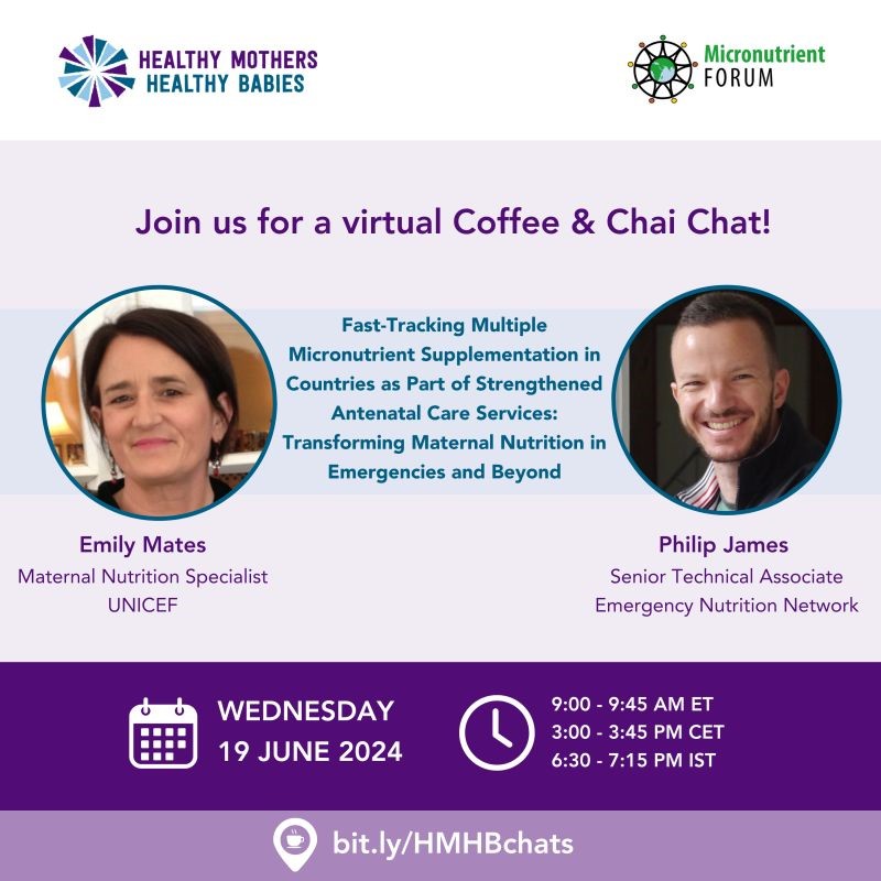 Join Healthy Mothers Healthy Babies Consortium's (HMHB) Coffee and Chai Chat featured Emily Mates from UNICEF and Phil James from Emergency Nutrition Network (ENN). The chat focuses on accelerating MMS in countries as part of antenatal care services in humanitarian settings and beyond. Don’t miss the opportunity to ask questions in real-time on the Acceleration Plan on Maternal Nutrition by UNICEF and partners and ENN’s new report on MMS in emergencies.