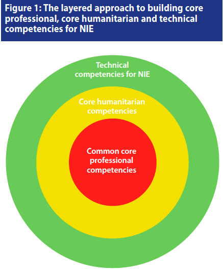 What this article adds: A technical competency framework for NIE is proposed, modelled on existing humanitarian frameworks. NIE competencies are categorised as core (professional and humanitarian) and technical (a behavioural indicator). The NIE framework contains twenty competency areas with 161 behavioural indicators categorised into three levels (reflecting seniority). The framework has been adopted for preliminary use by Concern Worldwide, World Vision, Valid International and International Medical Corps. While the majority of the technical skills are covered in NIE training courses, many general core competencies are neglected and thus limit effectiveness in the field.