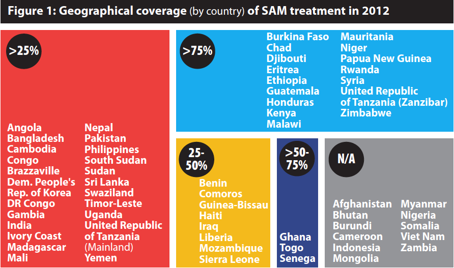 - Of the 60 countries that reported nutrition data in 2012, 8 (13%) did not report treatment coverage, 28 (47%) reported coverage under 25%, 9 (15%) reported coverage 25-50%, 8 (13%) reported coverage 50-75% and 7 (12%) reported coverage over 75% (see Figure 2).
