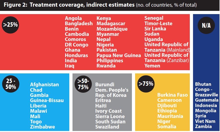 - The proportion of countries reporting treatment coverage <25% is high (47%). This is particularly important considering that treatment coverage derived indirectly produces (significant) overestimations. This means that the actual number of countries with treatment coverage <25% is likely to be higher.