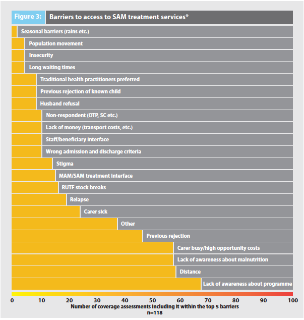 Availability of services (geographical coverage) does not equate with service access and uptake (treatment coverage). There are many other factors which positively and negatively influence uptake and success of SAM management. The data from sub-national coverage assessments compiled by the Coverage Monitoring Network provides some insight into barriers which influence attendance at SAM treatment services (Figure 3).
