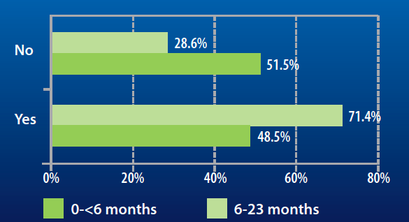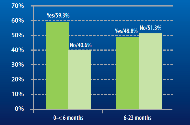 ACF has identified different practices hampering appropriate feeding and care for young children. Breastfeeding practices specifically as observed and assessed by the ACF field team are not optimal. Data collected from caregivers’ declaration at admission to the programme show that almost half of the children under 2 years old are not optimally breastfed according to WHO global recommendations (see Figure 2). According to field observations and discussion with caregivers, it also appears that caregivers spend little time breastfeeding and routinely supplement their breastmilk with water, sugar, tea and infant formula. Almost half of the infants aged 0-< 6 months admitted to the programme have received infant formula. This figure was more than 70% for children aged between 6-23 months (see Figure 3).