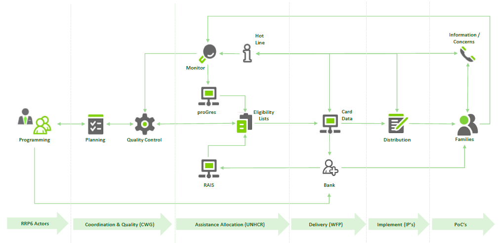 The crux of the future inter-agency programme design, building on in-country lessons to date, was defined through a consultancy led by Avenir Analytics, which set out to outline and define the optimal operational set-up for multipurpose CTP. This model aspired to build on the scale and coverage of WFP’s existing e-voucher programme (delivered through BLF bank) and use this delivery platform (through adding a separate cash ‘wallet’ to the same card), and WFP’s implementing partners, as the basis for the delivery of cash assistance. This model is visualised in Figure 1, and other key components of the programme design which evolved through multi-agency consensus are summarised in Box 2.