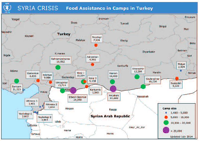 The Government of Turkey has generally maintained an open-border policy with Syria since the first Syrian refugees began crossing the border in April 2011. Three years later, Turkey hosts more than 900,000 Syrian ‘guests’ - 220,000 live in 22 camps and approximately 700,000 in urban centres. These estimates are considered conservative as registration continues and by the end of 2014, the Government expects the total number of Syrians refugees will reach 1.5 million. Prominent news sources, such as the New York Times, Reuters-Huffington Post, have expressed concerns about the livelihood of Syrians residing outside of camps; food security, shelter and education were among the most basic unmet necessities mentioned. Thus far, provision of food assistance to off camp populations is limited to small scale interventions within non-governmental organisations’ (NGOs) area of operations. In the coming months, WFP plans to offer technical assistance to the Government to conduct a needs assessment and develop an appropriate modality for the sustainable provision of food assistance to most vulnerable populations outside of camps.