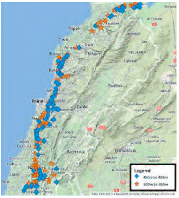 Because of Lebanon’s topography, the distribution of registered Syrian households living between 450 and 550 metres covers nearly the entire country, running from the north in Akkar to the south in Bint Jbeil. Figure 1 shows the location of all towns where survey respondents lived at the time when the winterisation programme began. In November 2013, when the programme began, survey respondents lived in 15 of Lebanon’s 25 districts (aqdia)8. Due to beneficiaries who moved between the beginning and end of the programme, interviews were conducted in all 25 districts.