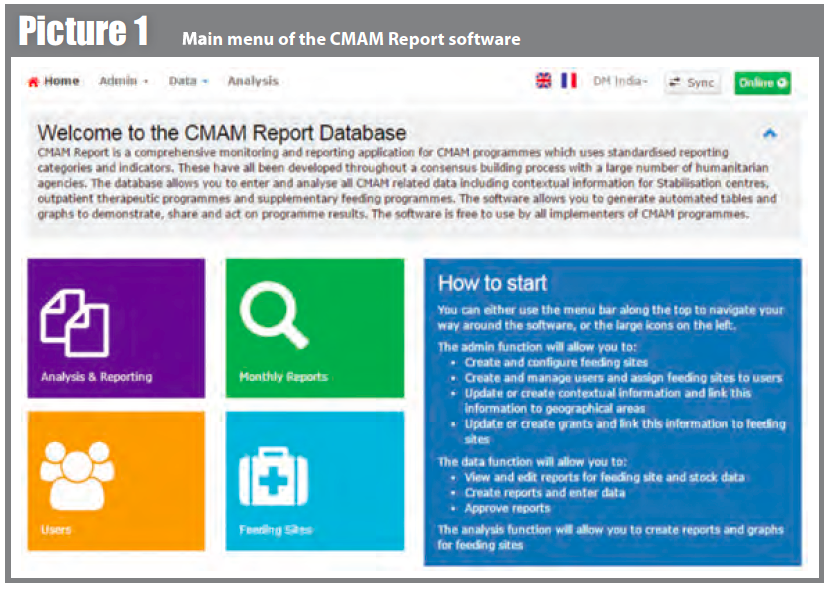 With the wider launch to the nutrition community mid-2015, CMAM Report can now be used on computers, laptops and tablets with a common browser4 and is freely available to all agencies/countries that wish to use it. The software supports secure data collection through controlled access from the field via country to headquarters levels (five adaptable user access levels). It enables the use of standardised reporting categories and indicators (enables comparable data and unbiased reporting) and gender and age disaggregated reporting through all reporting categories. Users can analyse data for trends and create summary tables and graphs by feeding site, group of feeding sites and geographical location up to country and global levels for any required time period in one month steps. The system features export of tables and graphs to PDF, Excel and Word. Raw data can be selectively exported to Excel and in turn to statistical software. Data entry mistakes are reduced by real-time validation checks.