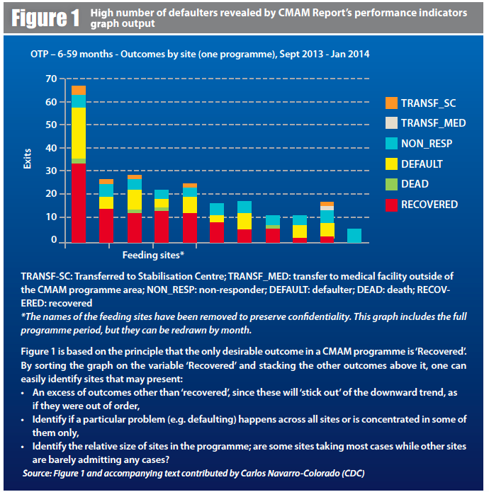 In Yemen, high defaulter rates were revealed and resulted in the management team adapting their programme delivery model. In Asia, a large number of defaulters were revealed due to a supply chain break. The CMAM Report software made this visible and results could be traced back to specific sites (Figure 1). In West Africa, the CMAM Report clearly showed a number of programming issues and therefore where to focus technical support. Stock management is one of the main challenges for CMAM programming and the CMAM Report is particularly effective and useful for estimating caseloads and supply needs, e.g. in Puntland, Somalia.