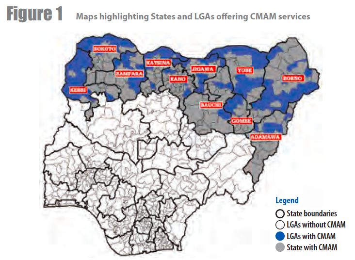 The Severe Acute Malnutrition (SAM) burden in Nigeria is known to be amongst the highest in the world, with over 10% of the global burden, resulting in an estimated 2 million children affected. Since 2009, the Government of Nigeria, with the support of UNICEF, started tackling the problem by piloting Community-based Management of Acute Malnutrition (CMAM) in two Local Government Areas (LGAs), one in Kebbi State and the other in Gombe State. Since then, Nigeria has proven their strong commitment to the fight against SAM, with geographical coverage extending to 91 LGAs in 11 states of the country, including 642 health facilities, as presented in Figure 1. This has also been possible as partners and donors have supported federal and state Ministries of Health (MoH) to institutionalise SAM management as part of regular routine health services. More than 1,000,000 children received treatment between 2009 and mid-2015.1