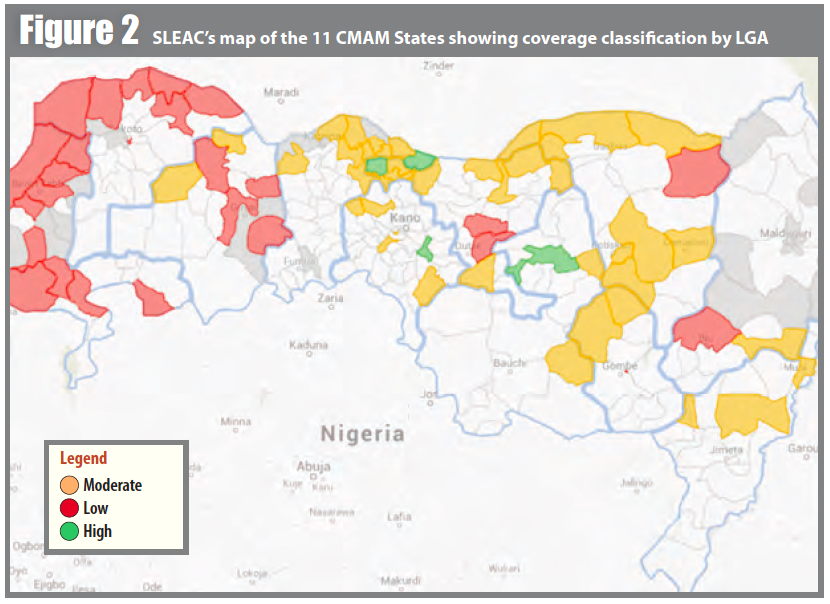 The Assessment of Coverage component was implemented in two phases. First, a SLEAC3 was conducted by Valid International to classify coverage of 71 of the 91 LGAs implementing CMAM programming between October 2013 and March 2014, providing an overall picture of the coverage levels of CMAM throughout a high proportion of LGAs. The SLEAC offered a clear view on both the geographical and the direct coverage of CMAM in the region, identifying regions, especially in the northwest, where efforts were needed most. The results are presented in Figure 2.