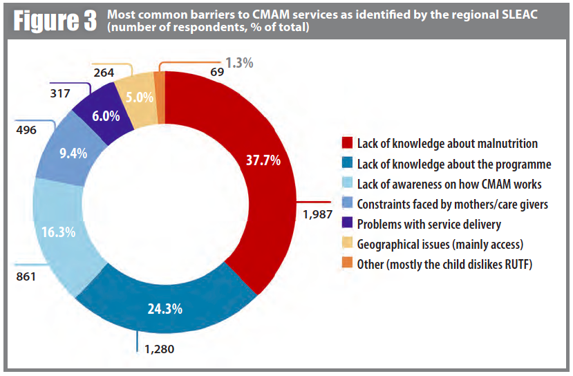 A national workshop was held with key stakeholders to review findings and identify locations for the second phase of this component. More in depth information on coverage was obtained through 12 Semi Quantitative Evaluation and Access of Coverage (SQUEAC) surveys which were implemented by ACF and Save the Children, with support of the Coverage Monitoring Network (CMN) and Valid International. A practical training was conducted in March 2014, when the first survey was jointly done. Then, Save the Children conducted five surveys in the northwest and ACF conducted six surveys in the northeast. All surveys were completed by December 2015. Key findings of the more in depth analysis provided by the SQUEACs on barriers to access are presented in Figure 3.