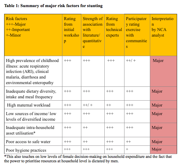 There is a need to engage all stakeholders in all stages of NCA to ensure they understand and buy into the process. The pace of implementation of recommendations is dictated by the clarity of response plans and engagement of technical and political leadership from the outset. The NCA approach encourages multi-sector participation; the mixed-method approach used benefits exploration and understanding of the causal links and interplay of various risk factors linked to undernutrition (in this instance, stunting).