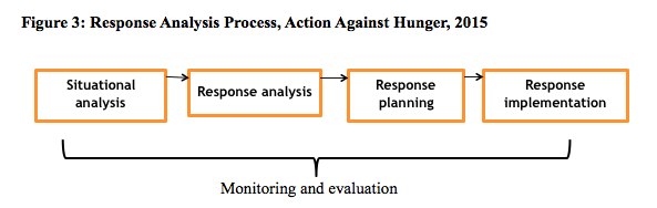 Response analysis is a step towards linking a situation analysis phase with a programme design or programming phase (Levine & Chastre, 2011; Maxwell & Stobaugh, 2012) as highlighted in Figure 3. Situation analysis itself is understood as a discrete phase that follows assessment but precedes response analysis, or more commonly is included as an initial or precursor to response analysis. In the latter, the results of situation analysis are viewed through the lens of response, analytical ‘gaps’ are plugged where they exist (severity, magnitude, target groups, vulnerability analysis, gap and risk analysis, etc.), and forecasting and scenario-building is undertaken before potential response options are identified (FAO 2011). Across the board, response analysis is essentially focused on identification, examination and selection of a set of appropriate and feasible response options, based on certain predefined technical and operational criteria.