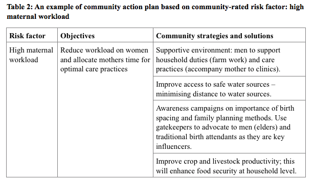In order to ensure multi-stakeholder engagement, three thematic areas were developed during the final workshop: health and nutrition; food security; and WASH. Cross-cutting themes such as advocacy, gender, care practices, environment, markets and trade were incorporated into the three thematic areas. One technical expert representative for each thematic area was appointed to lead during plenary discussions and on technical consensus-building in developing the problem analysis tree. The stakeholders within the thematic groups were involved in developing amenable solutions through converting problems into solutions using a solution analysis pathway matrix (Figure 4). They were also involved in formulating feasible interventions in relation to proposed community action plans (see example in Figure 5). The engagement of the SUN Civil Society Alliance (CSA) Movement was key in packaging the NCA findings and multi-sectoral response plans into clear advocacy messages used to inform county leadership, donors and implementing partners on the need to allocate resources based on identified priorities (see Table 3 for an example). The leaders present at the workshop including chief executive officers for health committed to allocating more resources for scaling up programmes for 2015-2016.