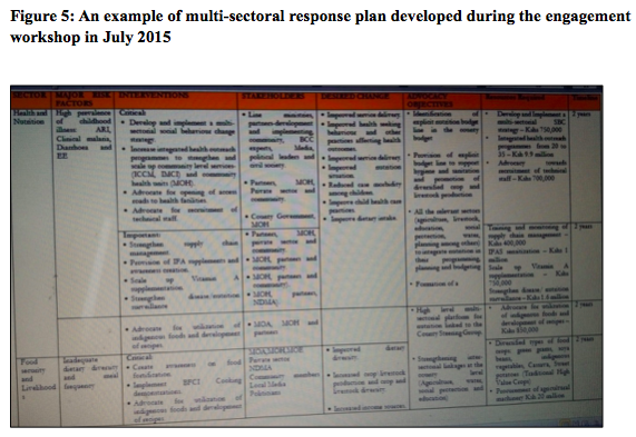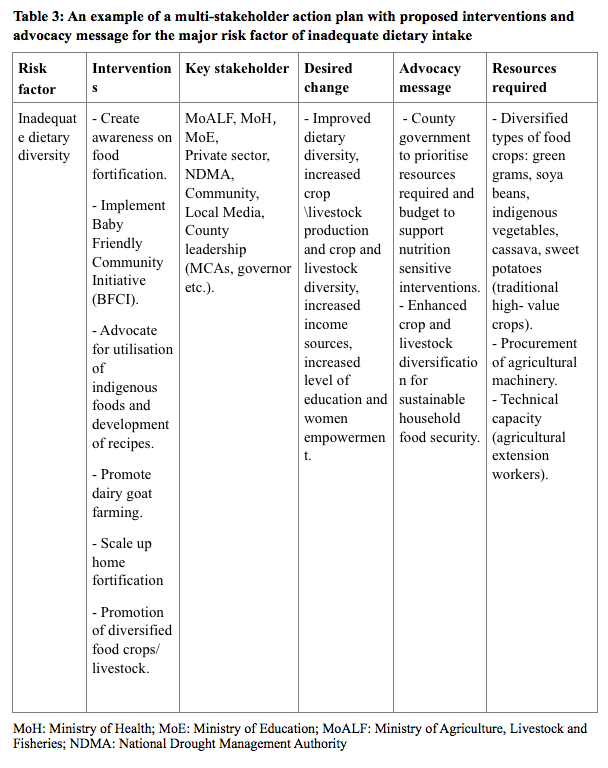 A sample size of 640 randomly selected households was achieved with 37 villages chosen across the livelihood zones. Multi-stakeholders at national and county levels were engaged in July 2015 through consensus-building on findings, rating exercise of risk factors and development of response plans. Results from the NCA formed the basis of a detailed multi-sectoral response plan towards the vision of collectively addressing stunting in the County. Technical representatives from various sectors used sector-specific findings to develop interventions through the problem, solution/intervention and stakeholder trees analysis approach. Community-rated risk factors and action plans derived during the field work in June 2015 were also prioritised in the process of developing multi-sector response plans. In addition to prioritising key interventions, the response outlined desired change, advocacy objectives and stakeholder responsibilities for the follow-up on implementation of interventions. Advocacy objectives were developed to guide planning and implementation of proposed interventions based on risk factors identified.