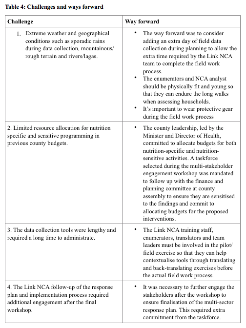 During the implementation of the NCA and response analysis process, a number of challenges were faced and ways forward identified, as highlighted in Table 4.