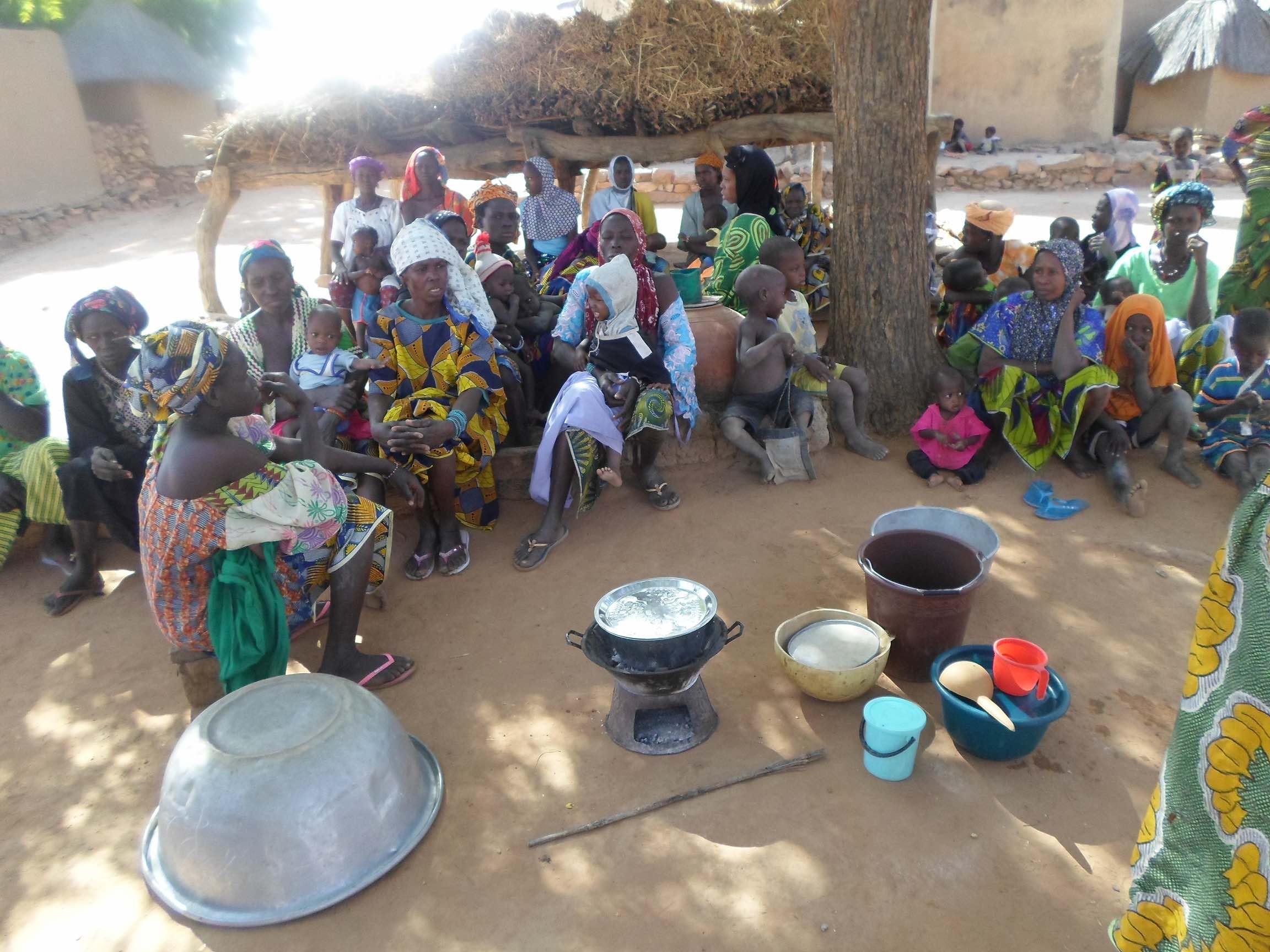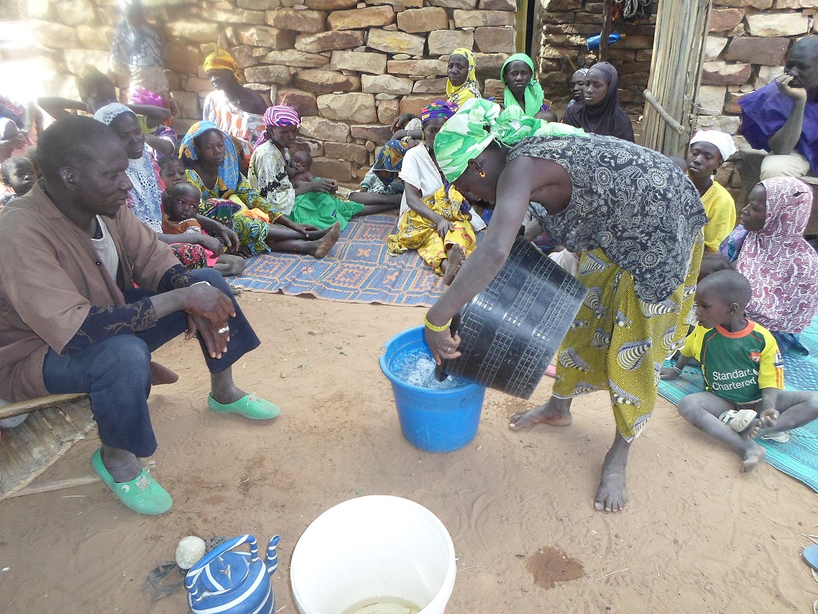 Nutrition demonstrations show parents the possibilities of expanding children’s diets by introducing locally available and affordable food products. WASHplus trained community health workers and agents to organise and lead nutrition demonstrations at the commune and village levels, as well as at community health facilities. The demonstrations discuss infant and young child feeding practices, including how much children of different ages should be eating. In addition, they classify foods and food groups so parents understand the importance of feeding children a variety of foods. The majority of the demonstrations promote enriched porridge made of millet, beans, peanuts, salt, sugar, baobab tree fruit, or tamarind – a nutritious meal that can be made with affordable, readily available foods. WASH is integrated into these demonstrations; hand-washing with soap before touching food is modelled and point-of-use water treatment is demonstrated or discussed.
