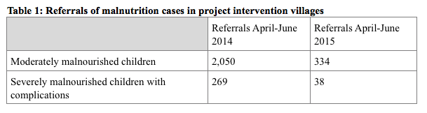 WASHplus has trained over 400 community extension workers to negotiate improved WASH and nutrition practices at the household level in 180 villages. Activities include CLTS triggering and nutrition and water treatment demonstrations at the community level and individual household visits that focus on promoting exclusive breastfeeding, hand-washing with soap, and nutrition counselling and referrals. These workers regularly monitor and refer malnourished children in project intervention villages. In the target areas the number of children referred has diminished drastically as shown in Table 1. The reduction in referrals is attributed to the early detection of growth faltering in communities through regular village screenings and treatment given at the community health centre before severe malnutrition occurs. It also could indicate that the health of children has improved while food insecurity has decreased. The endline survey may help to clarify the reasons behind this dramatic fall in referrals.
