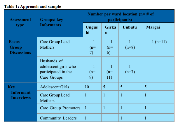 An assessment team comprised of five local interviewers employed qualitative methods, specifically 40 Key Informant Interviews (KII) and 7 Focus Group Discussions (FGD), with key stakeholders. Four villages in the Kebbe LGA, located in the Ungushi, Girkao, Unbutu and Margai Wards, were selected as they had the most adolescent girls involved in Care Groups. (See Table 1).