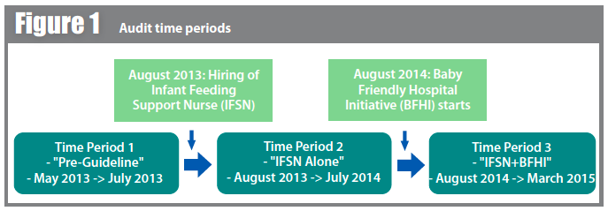 The audit involved retrospective, quantitative (infant data) analysis supplemented with qualitative (staff perceptions) data to evaluate the impact of implementing SAM guidelines and BFHI on the ward, but was primarily descriptive in nature. The three time periods for data collection and analysis of the audit are detailed in Figure 1.