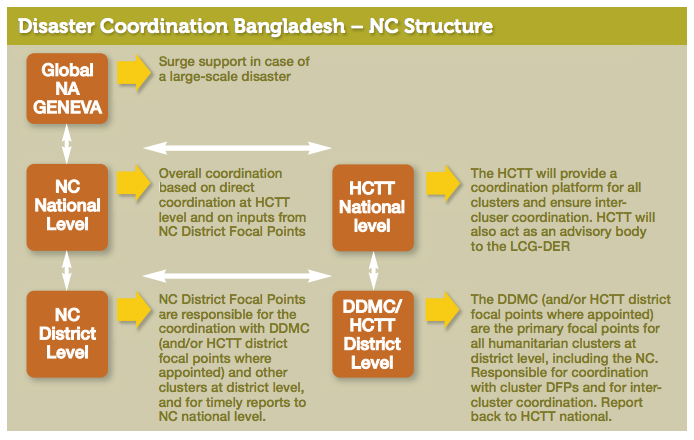 Wha this article adds: In 2012, the Government of Bangladesh (GoB) estalished a non-IASC national cluster system for all sectors focused on emergency preparedness. A Nutrition Cluster Coordinator provides both technical support to UNICEF programming (inlcuding SAM treatment scale up) and coordination (<50% time). Strategic areas of focus are nutrition coordination, assessment, information management, capacity development, nutrition programme support and cross-sectoral engagement. Challenges include district levels gaps in data collection and coordination capacity; lack of funding for preparedness; absent community based SAM treatment; and lack of a muti-sectoral framework. Sub-national clusters have been effectve in response, partnerships with academic institutions have enabled traning, assessment and capacity development. Coordination is currently in transition to develop one national streamlined forum to coordinate nutrition programming.