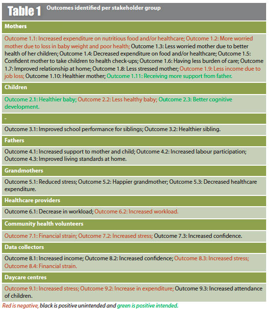 In the SROI process, outcomes were identified as perceived by the stakeholders and their values using financial proxies. The results confirmed the expected results (e.g. having healthier children, mother being healthier), identified other outcomes that were not expected (e.g. mothers received more support from fathers) and some outcomes identified were negative (e.g. increased level of worry for mothers due to challenges in introducing complementary feeding after exclusive breastfeeding for six months). In total, 34 outcomes were identified, with 11 negative ones and 20 positive but not expected (see Tables 1 and 2).