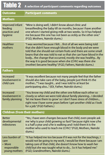 Data collection used a mixed-methods approach (focus group discussions (FGDs), key informant interviews (KIIs), in-depth interviews (IDIs), quantitative stakeholder surveys, and revealed preference using value games). The qualitative approach explored the impact of the intervention per stakeholder using data from 19 FGDs, 27 KIIs and 20 IDIs with a total of 161 participants. The quantitative stakeholder survey assessed the level of impact (frequency of people reporting an outcome), explored costs, duration and comparison with outcome if the project had not taken place. Data were collected on 281 participants (separate questionnaire for mothers, CHVs, grandmothers, daycare centres, business community, healthcare providers and data collection team). Value games were used to place value on outcomes which did not have a market value (e.g. confidence). These were conducted using additional 16 FGDs (mothers, fathers, grandmothers, CHVs, and data collection team) and six KIIs (daycare centres and therapeutic feeding centres). Findings were crosschecked and triangulated using other sources of data (randomised controlled trial and cost-effectiveness analysis using qualitative data).
