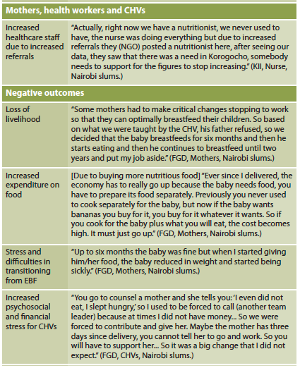 The MIYCN intervention showed overall an important positive impact. The intervention resulted in better mother and child health and increased confidence of mothers to exclusively breastfeed and better nutritional outcomes, among other things. Unexpected benefits were identified that could only be accounted for and quantified using the SROI approach. The impact was less important for grandmothers, fathers and CHVs. Nevertheless, these stakeholders also reported positive outcomes such as increased happiness and improved living standards at home. Key negative outcomes were also identified; for example, women foregoing work in order to breastfeed their children optimally, since their workplaces were not supportive. Overall, the intervention had a negative impact on daycare centres and healthcare providers, putting too much pressure on them without providing extra support. Daycare managers reported having to invest more but with the same income, as mothers were not willing to pay for improvements in the daycare centres. Community health volunteers also underwent psychosocial and financial stress emanating from the level of poverty in the communities in which they were working. Future interventions should consider such potential negative outcomes and find measures to mitigate them, which may include finding social protection measures for vulnerable populations.