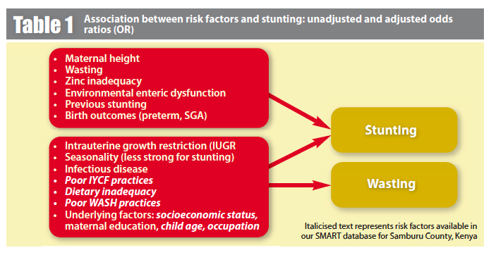 What this article adds: A secondary analysis of SMART survey data investigated socio-economic and health-related risk factors associated with stunting, wasting and both combined in 227 children aged 6-23 months in a poor, pastoralist Kenyan community. Stunting prevalence was 28.19%; wasting prevalence was 8.8% (WHZ) and 1.32% (MUAC <11.5 cm). In univariate logistic regression analysis, (lack of) hand-washing at four critical moments, having had fever or malaria in the past two weeks, and child age, were associated with stunting. In multivariate logistic regression analysis, no variable was significantly associated with stunting. Having access to toilet facilities was weakly associated with wasting. Children with concurrent wasting and stunting were significantly more likely to come from a household without any livestock ownership (p=0.03). The correlation between stunting and wasting was low at 5%. The analysis was limited (cross-sectional data does not capture seasonal trends; this secondary data analysis may have lacked statistical power). The authors recommend programme-specific data and measurement-related improvements to SMART to enable more meaningful analysis.
