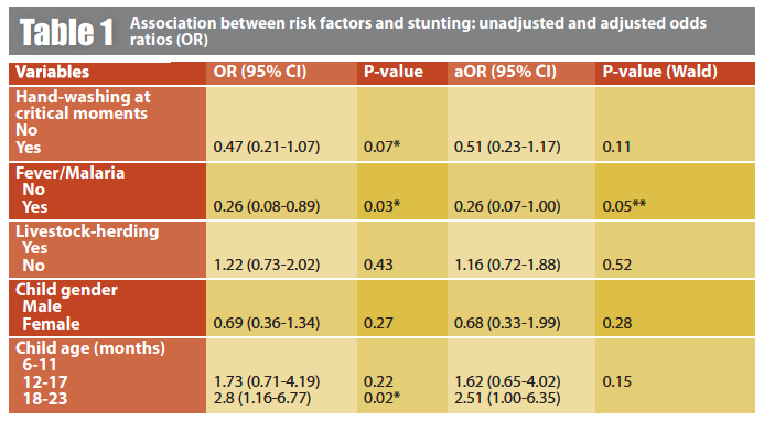 Data for a number of factors that have been shown to be associated with stunting and wasting, such as maternal nutritional status pre-pregnancy, during pregnancy and after delivery; parental educational levels; and comprehensive socio-economic status were not available in the current dataset. Stunting prevalence in this population was 28%, with severe stunting of 5%. In the univariate logistic regression analysis, (lack of) caretaker hand-washing at four critical moments, having had fever or malaria in the past two weeks, and child age were associated with stunting. After adjusting for all the variables and a priori variables in multivariable logistic regression, none of the variables turned out to be associated with stunting. However, there was a borderline association between having experienced fever or malaria in the past two weeks and stunting (adjusted odds ratio=0.26, 95% confidence interval=0.07-1.00, p=0.05).