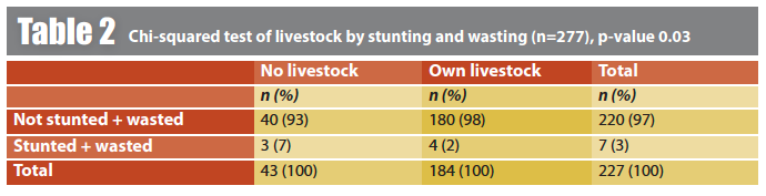 While only a small sub-sample of the population was found to be both wasted and stunted, these children were significantly more likely to come from a household without any livestock ownership (p=0.03). The correlation between stunting and wasting was low at 5%.