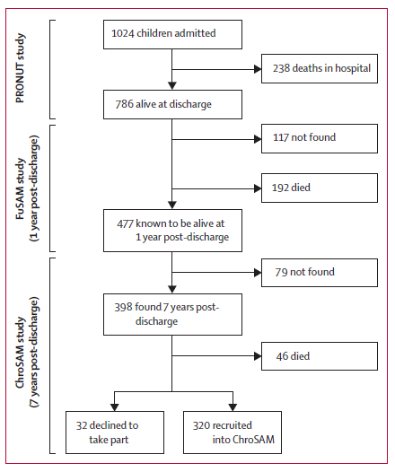 The original prospective cohort comprised 1,024 patients admitted for SAM treatment at Queen Elizabeth Hospital in Blantyre, Malawi, during a nine-month period (July 2006 to March 2007). All patients were treated with initial inpatient stabilisation using therapeutic milk, followed by nutritional rehabilitation with ready-to-use therapeutic food (RUTF) at home. The median age at admission was 24 months. The ChroSAM study group was made up of 320 surviving children from the original cohort, identified from a one-year post-discharge follow-up study (n=477). For comparison, the researchers aimed to recruit one sibling control (the sibling closest in age to the case child) and one community control (a child of the same sex and close in age living in the same community) per child in the case group. Children who had been treated for SAM were not eligible as controls.
