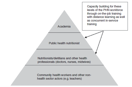 Unless increased priority and funding is given to building capacity for scaling up nutrition programmes in LMICs, maternal and child undernutrition rates are likely to remain high and nutrition-related non-communicable diseases are likely to escalate. A hybrid, distance-learning model for in-service training of PHN workforce managers is urgently needed in LMICs.