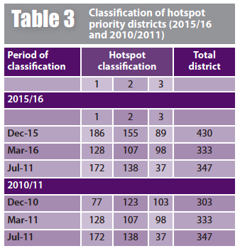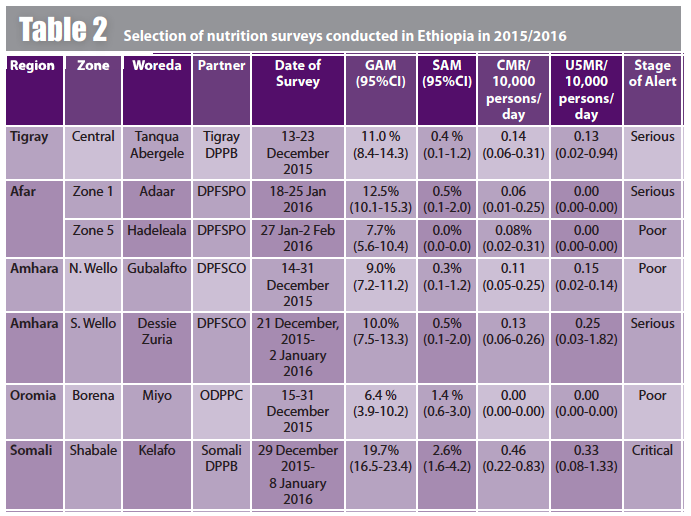 Twenty-one biannual standard nutrition surveys (BANs) were conducted between December 2015 and January 2016 (Afar, Amhara, Tigray, SNNPR and Oromia regions). Of the four classifications used to describe the nutrition situation, two out of 21 surveys were classified “critical”; four “serious”; 11 “poor”; and four “normal” or “typical” (see Table 2 for a selection of survey results). In addition, Ethiopia has an established early warning system, involving “hotspot” nutrition and food security data collection and classification systems, similar to the Integrated Food Security Phase Classification (IPC). In July 2016, a total of 420 hotspot priority 1 to priority 3 districts were identified, compared to 347 in June 2011 (see Table 3 for 2016 breakdown).