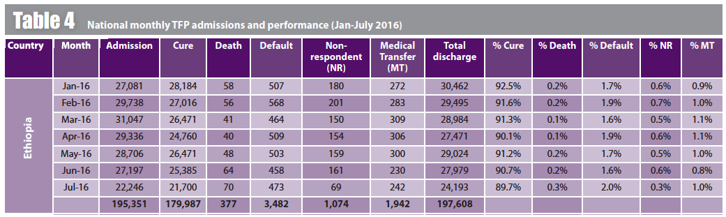 The nutrition situation and response was closely monitored by MOH/ENCU/ NDRMC in collaboration with nutrition partners using monthly TFP admissions, ad hoc surveys, updating hotspot woreda lists and examining nutrition responses. Analysis of these data indicated that the nutrition situation deteriorated considerably in most of the El Niño-affected districts of Somali, Afar, Amara, Oromia and SNNPR. A total of 195,351 SAM cases were admitted in over 14,568 TFP sites between January 2016 and July 2016 (88.6% reporting rate; see Table 4). This comprised 33,817 cases in SNNP; 88,270 in Oromia; 18,368 in Somali region; 29,086 in Amhara; 16,669 in Afar; 6,868 in Tigray; and 2,273 in other regions. By the end of the third quarter of 2016, the TSFP had reached 1,208,917 moderately malnourished children and 1,258,718 PLW.