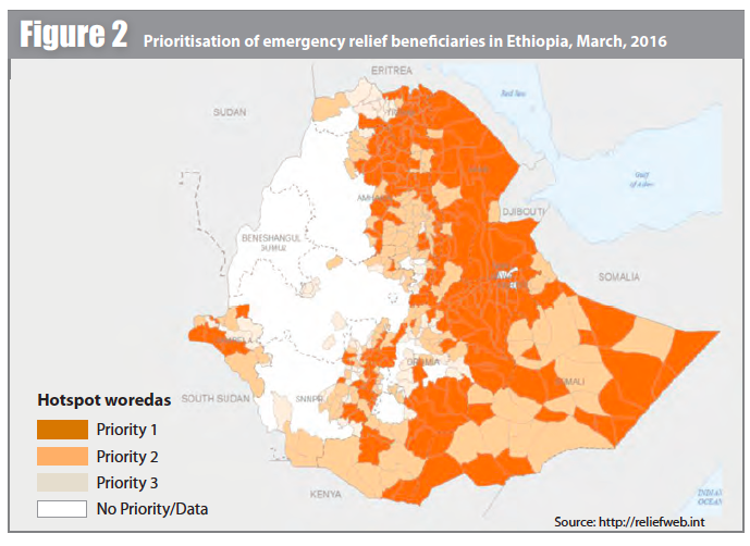 Management of moderate acute malnutrition (MAM): WFP supports the Disaster Risk Management and Food Security Sector (NDRMC) to deliver supplementary rations of corn-soya blend (CSB) and oil to MAM cases. In 2016, WFP was responsible for the provision of targeted supplementary food (TSF) rations for all priority 1 districts; rations were distributed through existing government systems. Since monthly screening began in Q2, delayed submission of information to WFP delayed WFP distribution of commodities to the affected population scheduled for the first quarter of the response and impacted on the formal release of the updated list of priority hotspot woredas by the Government. When released, the number of priority 1 districts had increased considerably, from 186 in December 2015 to 219 in March 2016.