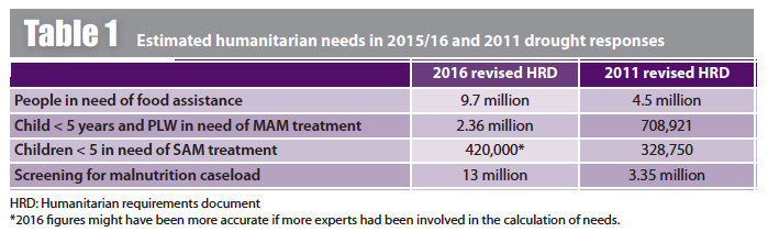 Responding to the nutritional needs of an emergency-affected population requires a commitment to a coordinated and collaborative approach among a collective of key actors. There was a significant improvement in the 2016 response compared to 2011 in terms of government leadership, national response, and coverage and quality of interventions. Humanitarian nutrition partners’ commitment to the country humanitarian coordination mechanism was excellent. Most actions were aligned with agreed priorities, used shared expertise and ensured that the nutrition response was based on sound and informed decision-making. This helped avoid or resolve gaps and duplication. Despite considerable progress, challenges remained. The 2016 response benefitted greatly from lessons learned and subsequent actions taken post-2011 drought; lessons from 2016 should inform preparedness and future response.