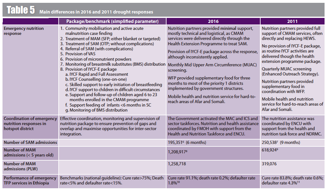 It is important that responses in hotspots do not focus solely on health facilities and that the emergency response is comprehensive; in both 2011 and 2016 most nutrition partners focused on treatment of severe malnutrition. Key future considerations include integration of emergency nutrition responses with WASH and health where needed; capacity-building of health staff and improvement of infrastructures for provision of TFP services; maximised and more timely IYCF-E support; strengthened monthly nutrition screening and expansion to the worst-affected Afar and Somali regions; and improved monitoring of the response with timely TFP reports and coordinated surveys.