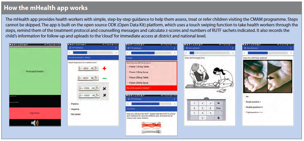 What this article adds: Between 2013 and 2016, World Vision, Save the Children and International Medical Corps (IMC) collaborated in the development and pilot of an mHealth app to improve CMAM treatment, reporting, monitoring and supply management in Afghanistan, Chad, Kenya, Mali and Niger. The pilot involved a public-private partnership with a software company, Dimagi. Overall, ministry engagement was good, although project continuity remains a challenge. Problems that significantly impacted in rollout plans included security issues limiting on-site training and technical support; complexities in contextualising country protocols; software bugs; and power and network coverage difficulties. With time, practice and support, health workers accepted the app and report many benefits for quality case management, although its use remains more time-consuming than the paper-based system. Several priorities have been identified for future rollout, scale-up and integration with national information systems and child health platforms. Simplified CMAM protocols and addition of the reporting feature would save time. An impact evaluation of the Kenya programme is due this year.