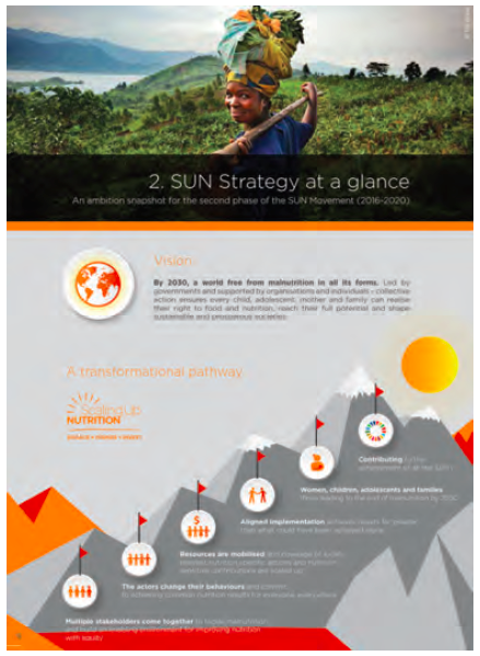 On 21st September, the new SUN Movement Strategy and Roadmap for 2016-2020 was launched, marking the second five year phase of the movement. The new strategy and roadmap is the product of a consultative process that spanned SUN countries, multiple United Nations (UN) and donor agencies, along with hundreds of international and national non-government organisations and businesses. It focuses on what countries have identified is needed to transform the momentum gained in the first phase of the Movement into tangible results. It retains its primary focus on the critical 1,000-day window of opportunity from pregnancy to second birthday. Several tools will help track progress and in 2019, a second independent evaluation to reassess the Movement’s relevance, efficiency and effectiveness is planned.