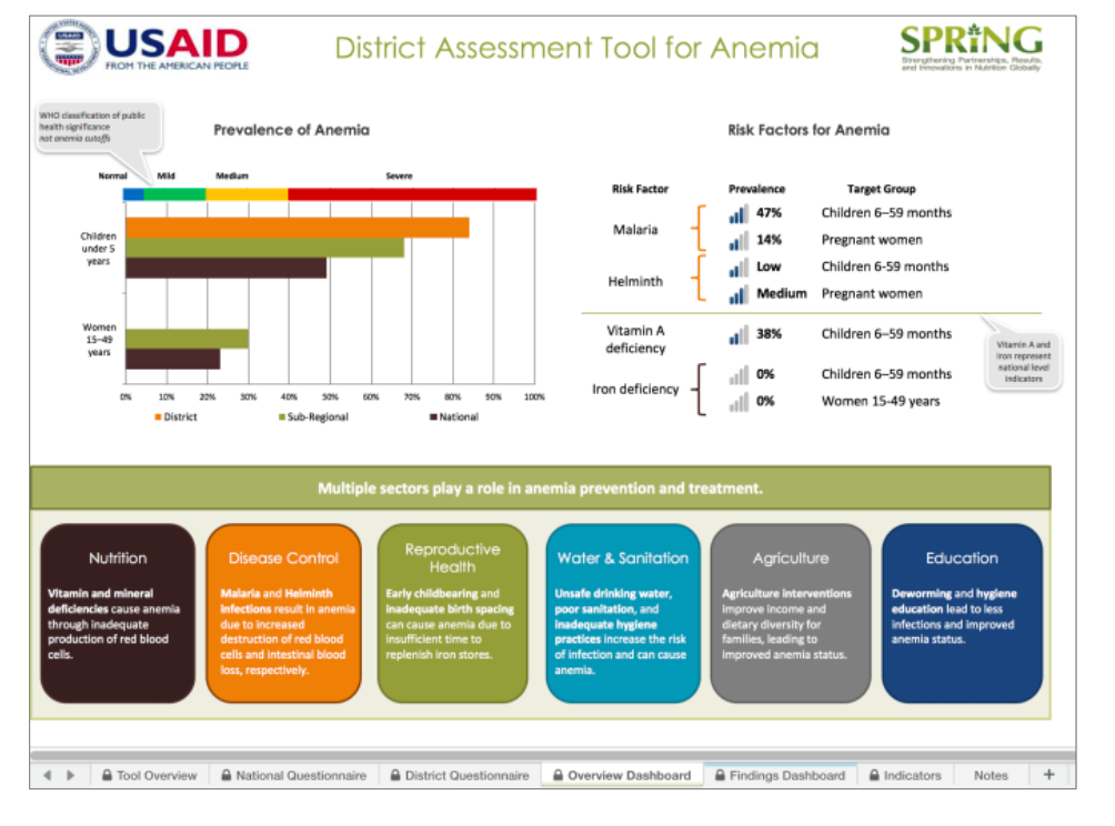 Anaemia is a complex problem with many varied, inter-related causes. Successfully addressing anaemia requires a multi-sectoral approach that is tailored for the specific risk factors in each context, which may vary even between regions and districts within a country. The USAID-funded Strengthening Partnerships, Results and Innovations (SPRING) project recently released two tools that help policy-makers and programme designers to better understand the anaemia situation in their country or local area, and to design appropriate interventions to accelerate the reduction of anaemia.