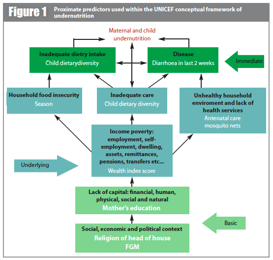 Using the UNICEF conceptual framework of undernutrition, indicators from the original survey were used as proxy measures for more commonly used indicators, based on prior literature. In this study, the immediate predictors were considered at the individual level of the child, while the underlying and basic predictors are at the maternal and household level (see Figure 1).
