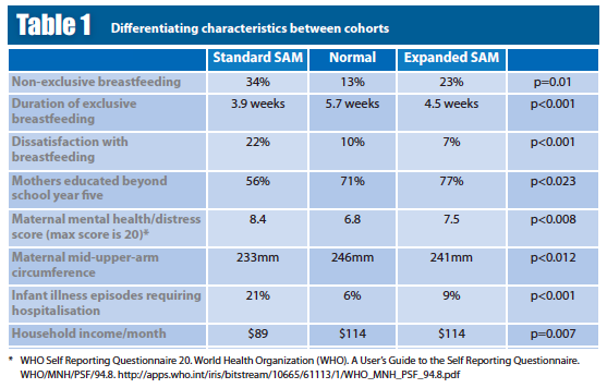 In the Standard and Expanded SAM groups, significantly fewer infants were still being breastfed, more infants were fed anything other than breastmilk at enrolment and endline, and more infants were given animal milk at an earlier age, compared to the Normal group. Duration of exclusive breastfeeding was also shorter in both groups, mothers breastfed less often, had higher mental health/distress score and were significantly less satisfied when asked how breastfeeding was going. Maternal Body Mass Index (BMI) and MUAC were lower in the Standard SAM group. More infants in the Standard SAM group had at least one episode of illness that required hospitalisation at enrolment; this proportion (21%) had increased to 40% by endline.
