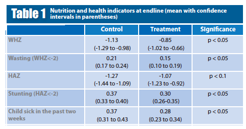 At the endline, children in the CRAM settlements performed significantly better than the non-intervention group on a host of key nutrition and health indicators. They had lower prevalence of wasting; higher WHZ; lower prevalence of chronic malnutrition (stunting); higher height-for-age z-scores (HAZ); and lower prevalence of illness (Table 1). Even when controlling for child, household and settlement characteristics using a random and fixed effects regression model, both being in the intervention group (p<0.1) and moving from not receiving CRAM to receiving CRAM (p<0.1) was significantly correlated to better household child nutritional status (i.e. minimum household WHZ).