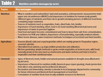 CfT targeted drought-affected malnourished households (referred from the nutrition programme), PLW and the most vulnerable people (those with disabilities and older people). It was designed to cover the extreme lean periods (September to November and March to August) when daytime temperatures can reach 50 degrees Celsius. The cash assistance was conditional on attending awareness sessions that delivered nutrition-sensitive key messages on nutrition, livestock and agriculture management; these focused on critical behaviours identified through a baseline knowledge, attitude and practices (KAP) survey (see Table 2). Each selected beneficiary received two days training on nutrition-sensitive messages followed by cash disbursement of PKR 6,000 (54 euros) per cycle through electronic mobile payment (Jazz Cash). There were three cycles so each beneficiary received a total of PKR 18,000 (162 euros). The cash amount was calculated based on the World Food Programme (WFP) food basket value for Pakistan. Cash disbursement was conducted in clusters near to the beneficiaries’ household, given the poor roads and transport facilities. The training time and duration was flexible in consideration of the target groups.