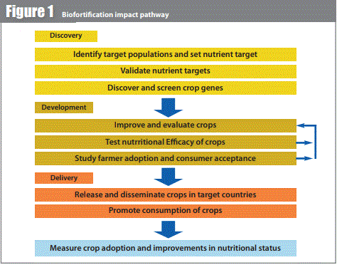 A three-stage process takes biofortification strategies from research to delivery (see Figure 1). Methodologies have been developed over the years to calculate the levels of extra minerals and/or vitamins required in diets to have a measurable public health impact. Resulting nutrient targets are used by economists and nutritionists to calculate the cost-effectiveness of biofortification strategies. This then guides donor investments in the development and testing of biofortified staple food crop varieties (calculation methodologies are described in detail in the AJFAND edition).