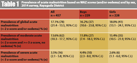 The study confirmed a predominately tribal population (92%), with the remaining minority made up of the Dalit1 people. The overall gender ratio among adults was 1,091 females:1,000 males and 943 females:1,000 males for children (no explanation is given for this gender discrepancy in the study report). The proportion of children under five years old was reported to be 8.5%, well below the expected under-five population of 14-15% based on the state birth rate. The infant mortality rate2 in the previous 12 months was 131 infant deaths per 1,000 (higher than the district infant mortality rate of 83 per 1,000). The major source of water in the area is tube well. Primary sources of income are wage labour (59.5%) and farming (39%), with people often involved in both. Migration for employment is low; only 293 migrations were reported in the last 12 months.