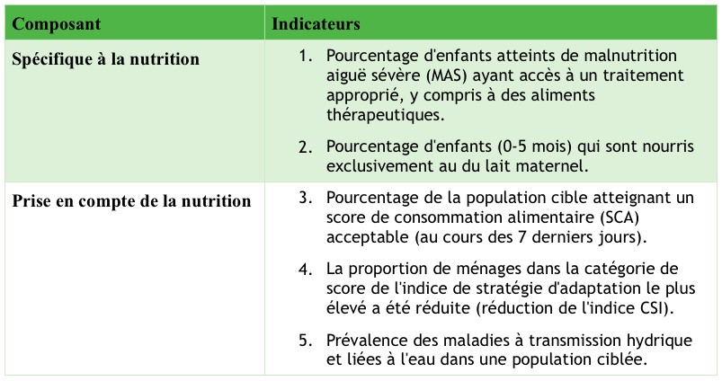 Le ciblage prenant en compte la nutrition a été déterminé en grande partie par la composante spécifique à la nutrition, dans laquelle les ménages ayant des enfants inscrits au programme de GCMA ont été référés aux services de SAMS et d'EAH. Le projet visait à rejoindre au moins 80 % des ménages parmi le nombre de cas recensés dans les zones sensibles à la nutrition et à leur apporter un soutien au moyen d'interventions de SAMS et d'EAH (voir la figure 2). Le ciblage géographique dans les sites sélectionnés3 a également suivi l'approche nutritionnelle des zones sensibles. Il fallait procéder au dépistage de tous les enfants âgés de 6 à 59 mois pour calculer la prévalence de MAG du village ; ceux ayant un taux de MAG plus élevé ont été sélectionnés pour l'intervention. Les autres bénéficiaires du SAMS et du EAH ont été identifiés à partir des mêmes sensibilités nutritionnelles des villages en utilisant les critères de vulnérabilité guidés par l'analyse de l'économie des ménages (AEM) (c.-à-d. les ménages très pauvres et pauvres en termes de classement en fonction de la richesse). Des indicateurs intégrés ont été développés pour le projet (voir le tableau 1).