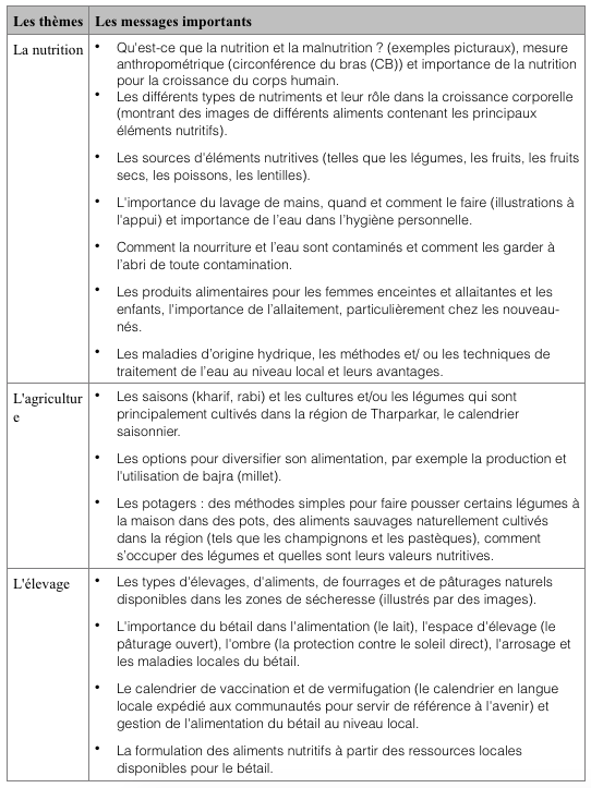 Les fonds pour la formation s'adressait aux ménages souffrant de malnutrition et frappés par la sécheresse (visés par le programme de nutrition), aux femmes enceintes et allaitantes et aux individus les plus vulnérables (personnes handicapées et personnes âgées). Ils ont été conçus pour couvrir les périodes extrêmement difficiles (de septembre à novembre et de mars à août) lorsque les températures diurnes peuvent atteindre les 50 degrés Celsius. L’aide financière était conditionnelle à la participation à des séances de sensibilisation qui transmettaient des messages importants sur la gestion de l’alimentation, de l’élevage et de l’agriculture ; ces messages étaient axés sur des comportements essentiels identifiés par l'étude des connaissances, des attitudes et des pratiques (CAP) de base (voir tableau 2). Chaque bénéficiaire sélectionné a reçu deux jours de formation sur des messages tenant compte de la nutrition, suivis par un déboursement de 6 000 roupies pakistanaises (54 euros) par cycle, au moyen de paiement mobile électronique (Jazz Cash). Il y avait trois cycles, chaque bénéficiaire a donc reçu un total de 18 000 roupies pakistanaises (162 euros). Le montant financier était calculé selon la valeur du panier alimentaire du Programme alimentaire mondial (PAM) pour le Pakistan. Les déboursements étaient réalisés en groupes, près de l'endroit où vivaient les bénéficiaires, compte tenu du mauvais état des routes et des infrastructures liées au transport. L'heure et la durée de la formation étaient flexibles en fonction des groupes cibles.