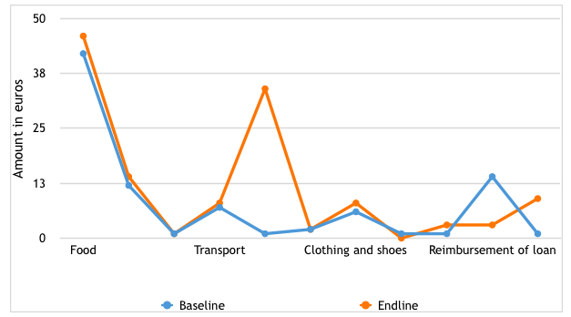 L'étude de base a révélé qu'en moyenne, les bénéficiaires dépensaient 88 euros par mois pour couvrir toutes les dépenses du ménage, ce qui incluait les dépenses alimentaires, non-alimentaires et le reste. À la fin, les dépenses mensuelles des ménages s'élevaient à 128 euros, soit une hausse de 40 euros, attribuée à l’aide en espèces. L'analyse des tendances montre que les bénéficiaires ont augmenté leurs dépenses liées à l'alimentation, la santé, les intrants agricoles, les vêtements et d'autres articles non alimentaires. Le principal secteur d'augmentation des dépenses a été l'achat d'intrants agricoles pour la prochaine saison agricole, alors qu'il y avait une réduction considérable du remboursement des prêts. Cela suggère que ceux qui recevaient de l'argent sont passés de l'achat comptant au système de crédit structurel traditionnel4 (Voir la figure 3). Un total de 15 288 femmes (femmes enceintes et allaitantes et/ou personnel soignant auprès d'enfants) était couvert par cette activité ; les hommes représentaient 6 % (n = 908) des bénéficiaires.