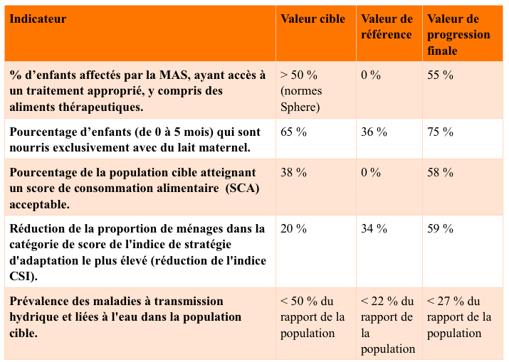 Le projet visait à réduire la prévalence de la malnutrition aiguë grâce à des interventions spécifiques à la nutrition (une gestion communautaire de la malnutrition aiguë (GCMA) et du soutien à l'alimentation des nourrissons et des jeunes enfants (ANJE)) combinée à des actions prenant en compte la nutrition qui abordaient des facteurs importants et interdépendants ; de manière spécifique, les pratiques de soins maternels, de soins aux nourrissons et de soins infantiles2; les mesures d'hygiène ; la fourniture d'infrastructures hydrauliques ; l'accès à un régime nutritif riche et diversifié ; et la gestion du bétail. Les interventions prenant en compte la nutrition ont nécessité :